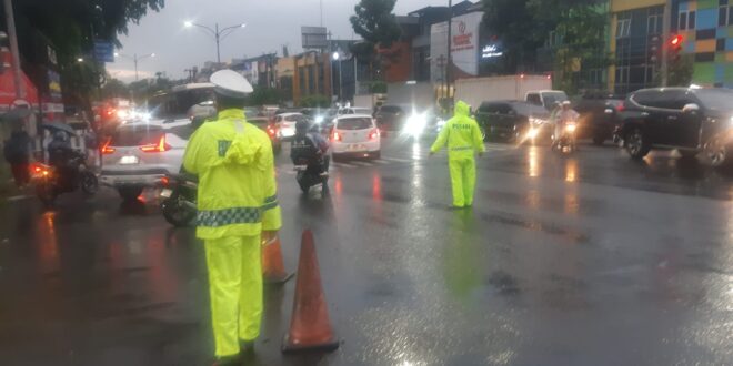 Personel Lantas Polsek Rawalumbu Lakukan Penguraian Kemacetan Akibat Hujan Deras