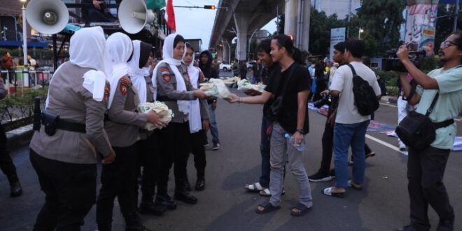 JAKARTA – Pemandangan berbeda terlihat dalam pengamanan penyampaian aspirasi oleh kelompok mahasiswa di depan Mabes Polri, Jumat (27/2). Memasuki bulan suci Ramadhan, Polda Metro Jaya menerapkan pola pengamanan progresif yang jauh dari kesan kaku. Alih-alih barikade yang intimidatif, para personel yang bertugas justru tampil religius dengan mengenakan peci dan syal bagi polisi laki-laki, serta jilbab bagi Polwan, sebagai bentuk penghormatan terhadap kekhidmatan bulan puasa.